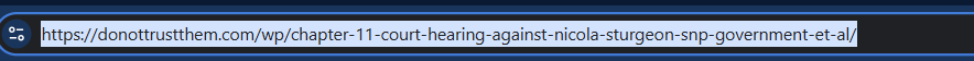In the Caledonia Housing Association section CHAPTER 11. Court Hearing Against Nicola Sturgeon/SNP/Government and enablers. I have not directly linked it as I have just noticed the search engines have added -et- al to the end of my usual direct link. https://donottrustthem.com/wp/chapter-11-court-hearing-against-nicola-sturgeon-snp-government-et-al/ This seems to be direct interference by them (not for the first time) and may be an attempt to conceal my website and this particular page. I am not a techy person, but I do know that the govt are capable of using their taxpayer paid resources to silence those who speak out. They have the Means the Motive and the Opportunity. They did not corrupt everything without putting many protections in place – to enable them to avoid accountability