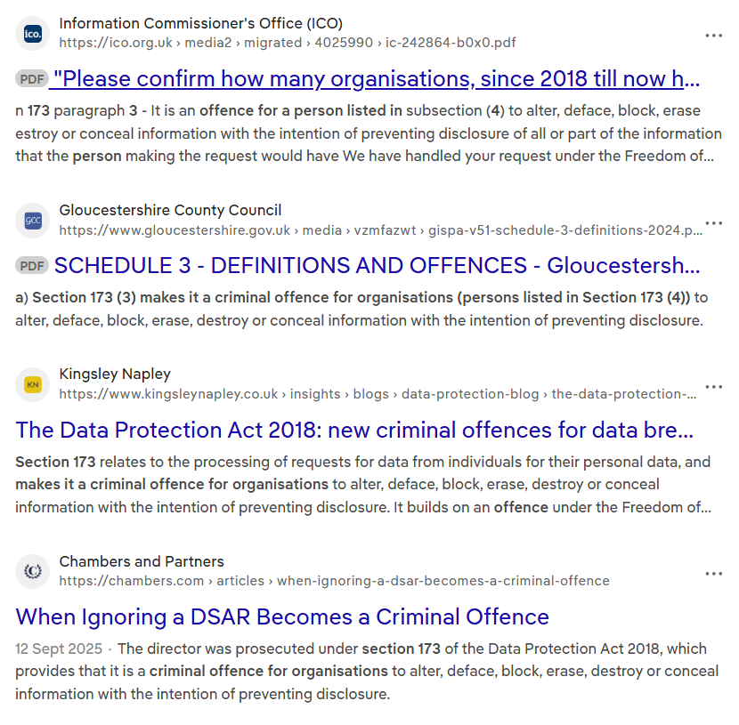 Section 173 relates to the processing of requests for data from individuals for their personal data. Section 173 (3) makes it a criminal offence for organisations (persons listed in Section 173 (4)) to alter, deface, block, erase, destroy or conceal information with the intention of preventing disclosure. It builds on an offence under the Freedom of Information Act 2000. Possible defences to an offence under section 173 (3) are set out in Section 173 (5).