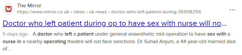 “Married doctor, 44, who left patient on operating table in the middle of surgery to have sex with a nurse is cleared to resume his medical career”.