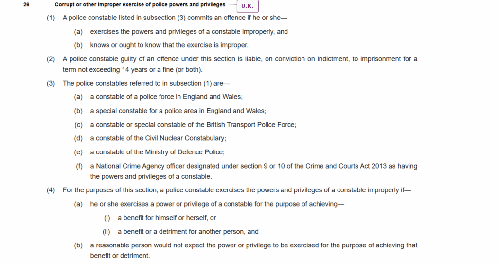 This guidance sets out the key legal elements of the offence and the factors that prosecutors should consider when applying the Code for Crown Prosecutors in cases where MiPO is alleged. Where a case concerns a police officer, prosecutors should also consider the statutory offence of police corruption contrary to section 26 Criminal Justice and Courts Act 2015.”