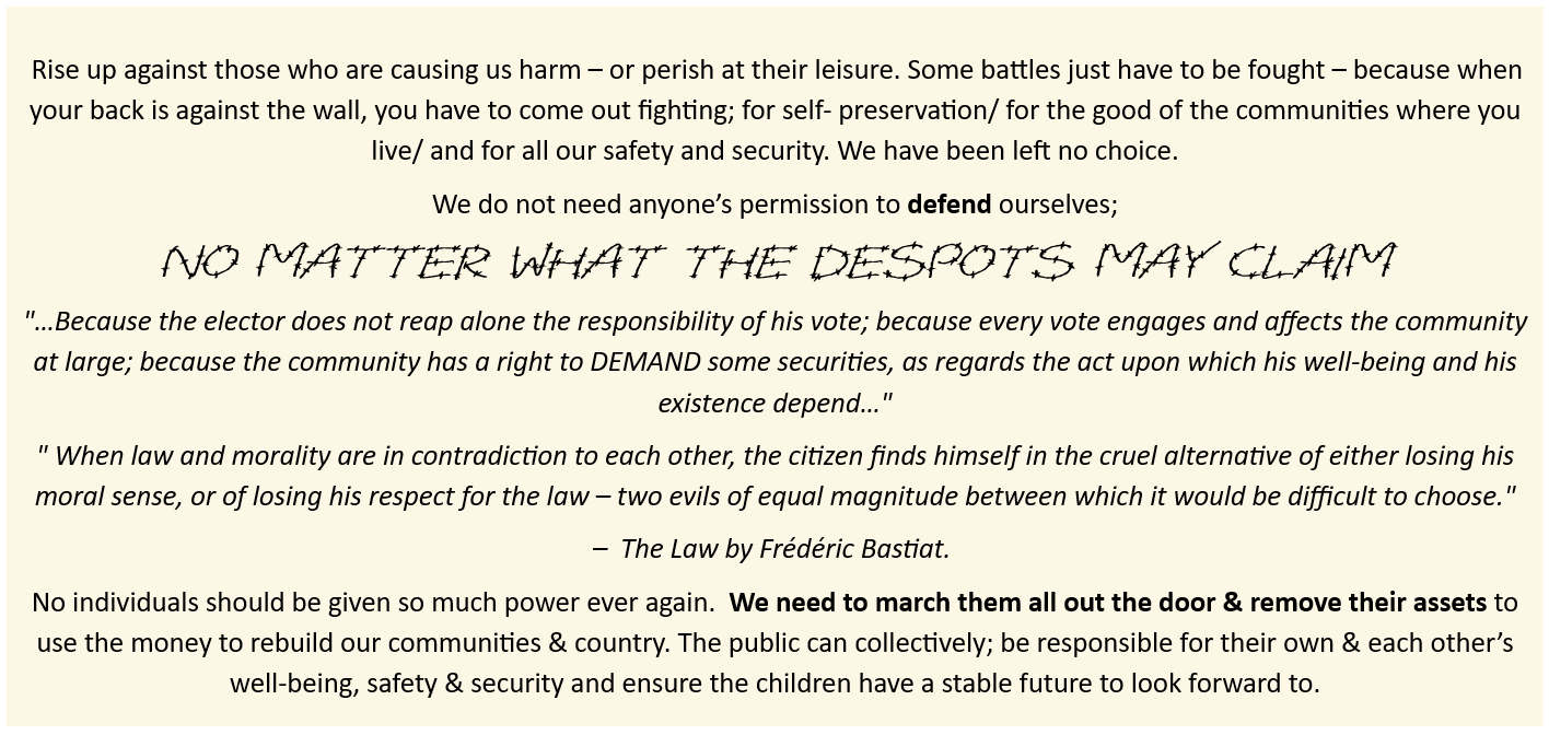 Meanwhile, our shady fake leaders & co continue operating in the shadows with foreign influence – to betray us even further – via their global contacts to increase more threats into the country so we are weakened further, from the inside. Then assisted by the rest of the so-called authorities, they avoid accountability. WHY do we pay for any of these parasitic frauds? They are neither use nor ornament, we would be better off looking after ourselves; by directly employing competent, trustworthy individuals, working in our interests instead of against us!