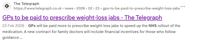 04/03/26 A conflict of interest: The latest, additional wealth grab by the greedy, state sponsored drug dealers [colluding with Big Pharma ] – the GP’s employed in the Negligent Health Service are to be given a bribe of £3,000 to push weight loss drugs on vulnerable, trusting patients. Instead of dealing with the social problems which successive govts have created/exacerbated, example poor living standards, poverty and inequality, they much prefer the profit making route – again. If the food available to the public is too expensive; then highly processed, sugar laden food will be the only alternative. Just as the decision-makers planned.