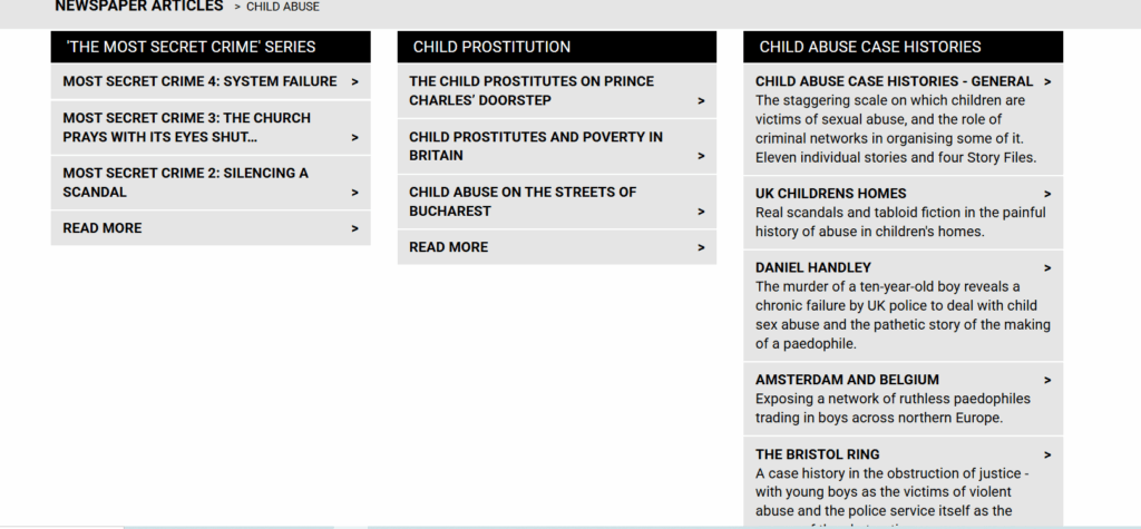 “The huge scale of child sex abuse; the hopeless weakness of state agencies in dealing with it; the growth of child prostitution on the streets of UK cities; and the inside story of paedophile networks operating across Europe. Three Story Files and four individual articles.”